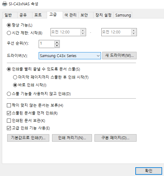 6. 고급 탭에서 "드라이버" 항목에 자신의 프린터가 제대로 선택되었는지 확인