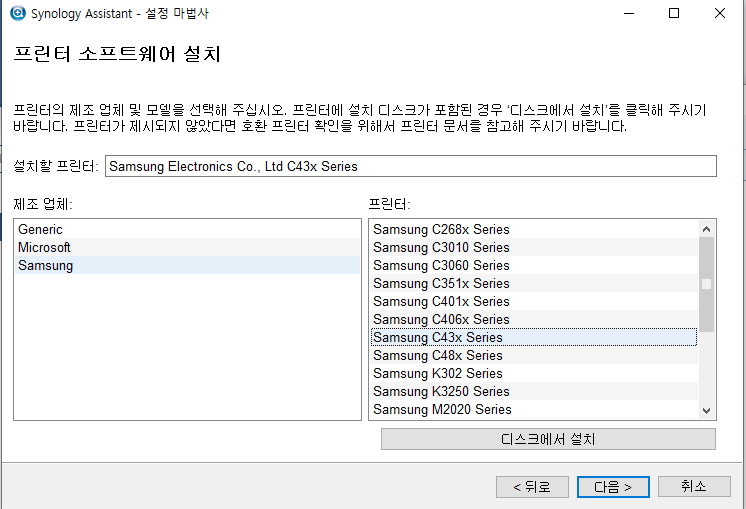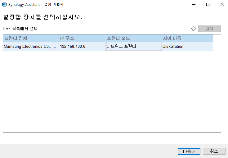 2. 시놀로지 어시스턴트에서 프린터 검색 후 드라이버 설치