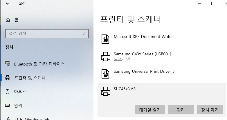 3. 설치된 프린터 선택하고 "관리" 클릭