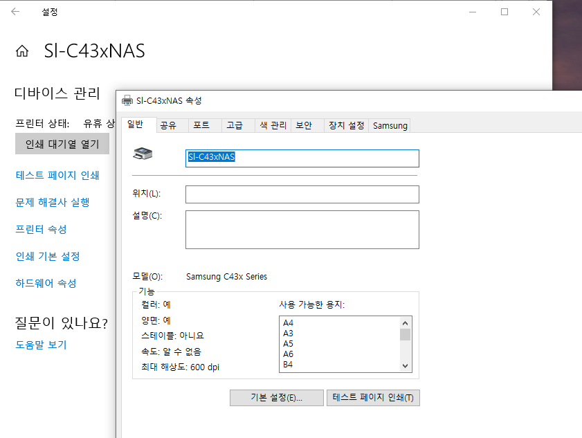 프린터 드라이버의 설정이 제대로 안된 경우임